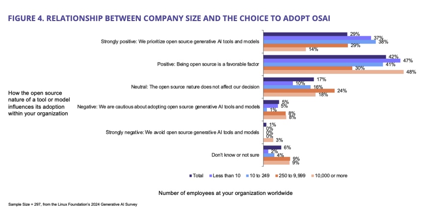 小型企业对开源的依赖尤为明显。 根据调研,中小企业比大型企业更倾向于选择开源模型,以实现成本控制与快速部署。