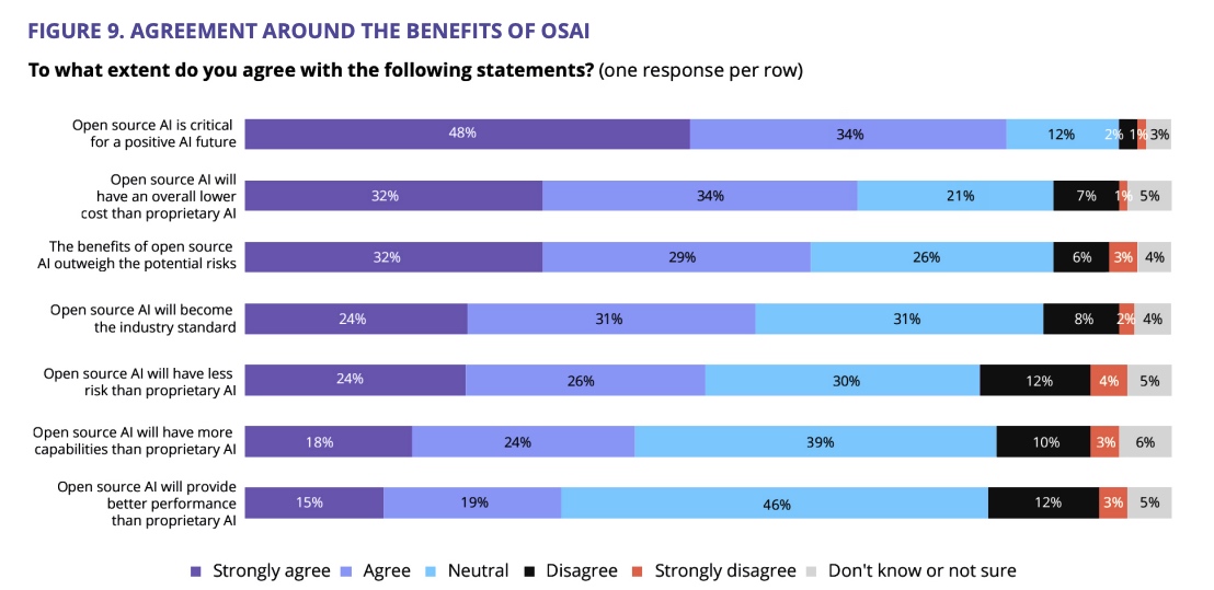 该报告显示,94% 的受访企业已经在使用 AI,其中 89% 的 AI 用户采用了某种形式的开源 AI 解决方案。