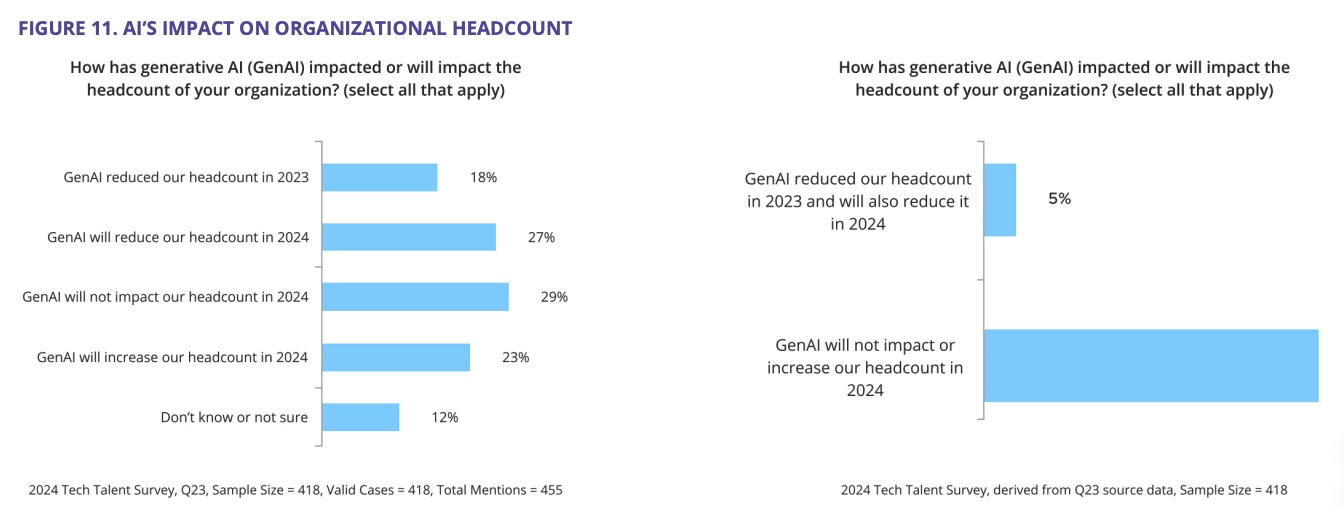 Linux 基金会 2024 年技术人才调查显示,2023-2024 年仅有 5% 的招聘经理报告 AI 减少了组织人员的编制。而多数受访者预计未来一年内 AI 对人员编制影响有限,甚至可能因 AI 相关岗位需求增加而扩招。2025 年最新调查延续这一趋势,越来越多组织因 AI 采用而增加招聘,而非裁员。