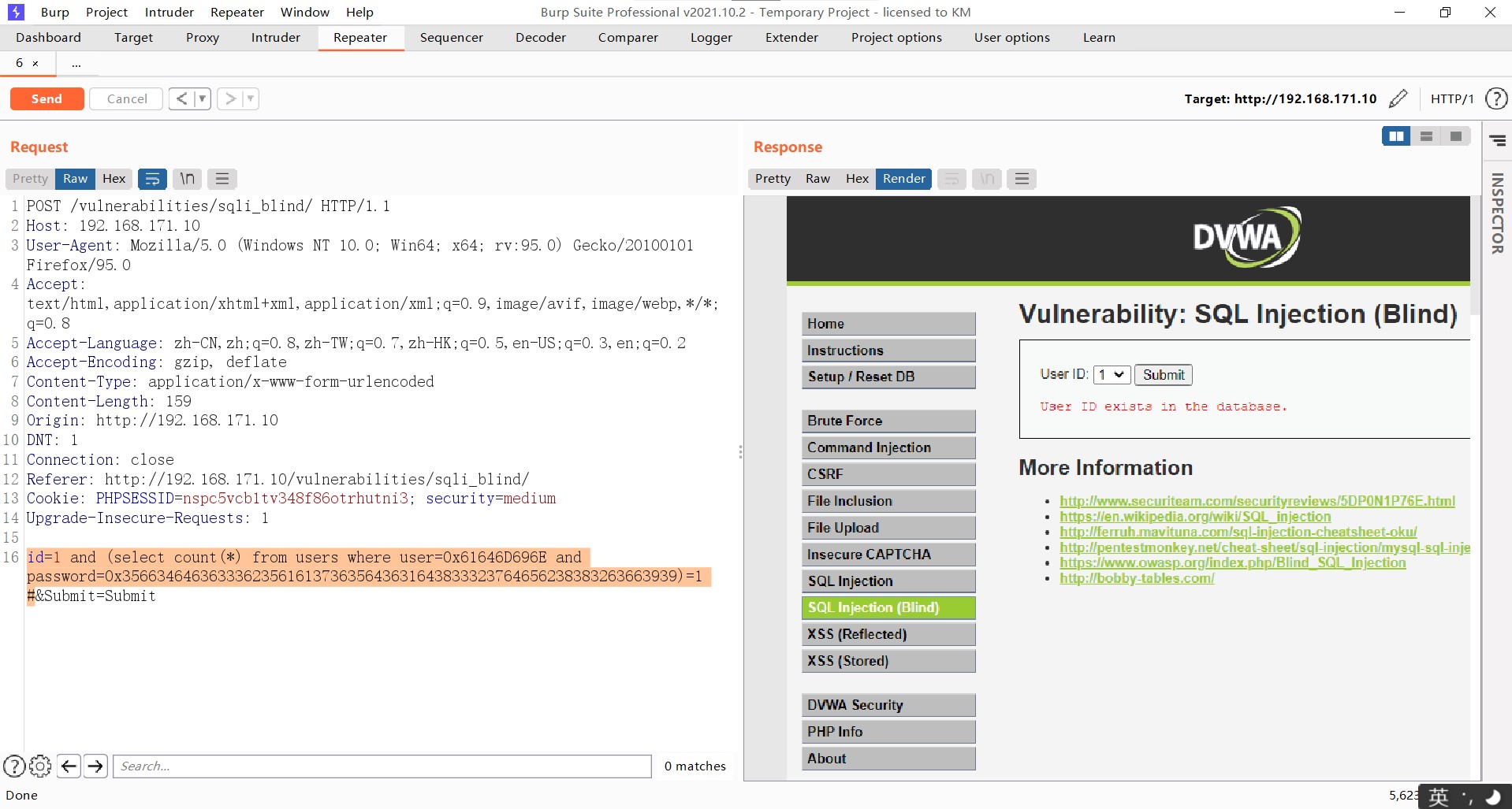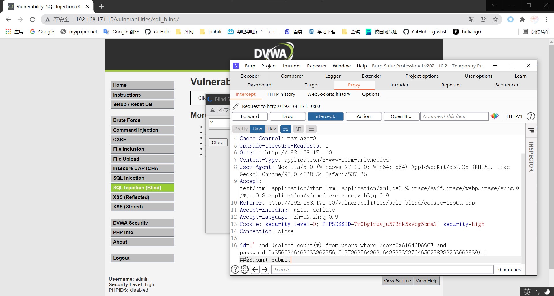 –second-url指定二阶响应的结果显示页面的url,本等级中192.168.171.10/vulnerabilities/sqli_blind/cookie-input.php为输入参数的地址,而http://192.168.171.10/vulnerabilities/sqli_blind/为显示结果的地址,两个不在同一个页面上,所以要设置second-url