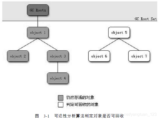 JVM中,当创建的对象不再被使用的时候,此时我们认为他是无用的“垃圾”;在现代主流的商用jvm中,都是通过可达性分析来判断对象是否存活的。这个算法的基本思想是通过一系列“GCROOT”的对象来作为起始点,从这些节点开始向下搜索,搜索所做过的路径称为引用链,当一个对象没有任何引用链可达时,就判断该对象不可用。如下图,obj5,obj6,obj7虽然相连,但是没有引用链到达“GCROOT”,因此它也是不可用的。