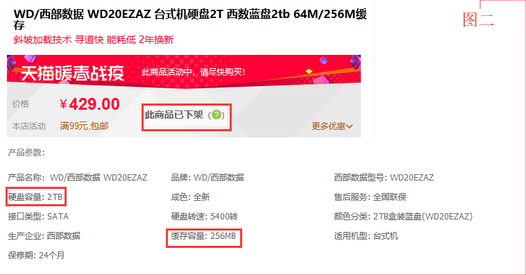 其中西数天猫旗舰店2TB硬盘64MB硬盘已经下架,其价格是¥429。我在其他店看的西数2TB机械硬盘256MB缓存价格¥349,竟然比64MB缓存的价格还要低。