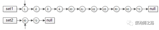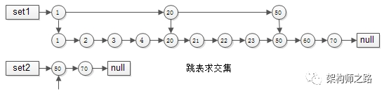 如此这般,在实施“拉链”求交集的过程中,set1的指针能够由1跳到20再跳到50,中间能够跳过很多元素,无需进行一一比对,跳表求交集的时间复杂度近似O(log(n)),这是搜索引擎中常见的算法。