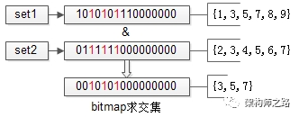 如上图,假设set1{1,3,5,7,8,9}和set2{2,3,4,5,6,7}的所有元素都在桶值[1, 16]的范围之内,可以用16个bit来描述这两个集合,原集合中的元素x,在这个16bitmap中的第x个bit为1,此时两个bitmap求交集,只需要将两个bitmap进行“与”操作,结果集bitmap的3,5,7位是1,表明原集合的交集为{3,5,7}