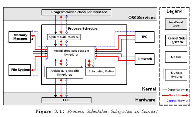 正如前面提到过的,调度器需要调用内存管理器提供的功能,去为需要恢复执行的进程选择合适的物理地址,正因为如此,所以 进程调度器子系统依赖于内存管理子系统。当其他内核子系统需要等待硬件请求完成时,它们都依赖于进程调度子系统进行进程的阻塞和恢复。这种依赖性通过函数调用和访问共享的 task list 数据结构来体现。所有的内核子系统都要读或者写代表当前正在运行进程的数据结构,因此形成了贯穿整个系统的双向数据流。