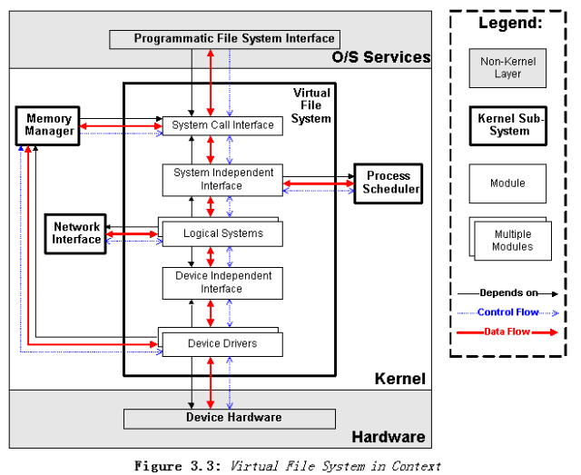 正如前面提到的,内存管理器使用 VFS 完成内存交换功能和内存映射 I/O。另外,当 VFS 等待硬件请求完成时,VFS 需要使用进程调度器阻塞进程;当请求完成时,VFS 需要通过进程调度器唤醒进程。最后,系统调用接口允许用户进程调用来存取数据。不像前面的子系统,VFS 没有提供给用户注册不明确调用的机制,所以没有从VFS到用户进程的控制流。