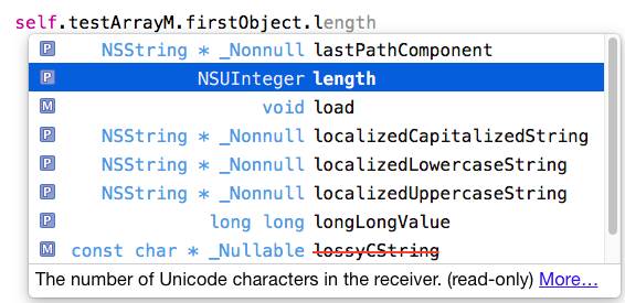 我们在调用属性或者方法时候, 系统会提示你当前的对象是否为nil如下图: