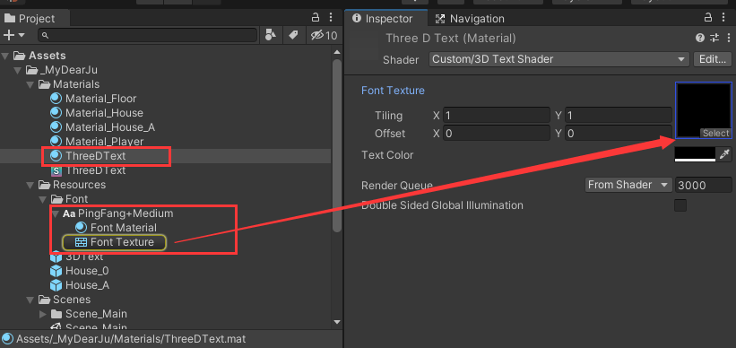 把你想要用的字体拖拽到Unity中来,然后字体下边的Font Texture,赋值给当前的Material。