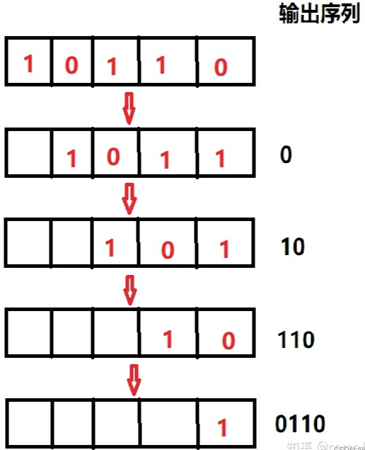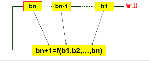 也就是数据挨个从左到右(从右到左)的移出,右边移出一位左边就空出一位,空出的这一位大部分情况下默认补0,如果这一位我们通过某个函数来计算,这个函数的输入就是寄存器组中已有的这些数,函数的输出填到左边空出的这一位,通过这种方式我们就进一步得到了反馈寄存器,也就是FSR,它可以源源不断的进行输出,贴个图:
