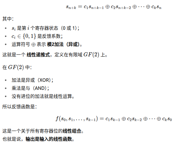 再进一步,如果这个反馈函数,是一个线性的函数呢?这里略微补充下线性函数的定义,就是满足f(ax+by)=af(x)+bf(y)这样的函数,典型的就是f=ax+b,而LFSR的反馈函数定义如下: