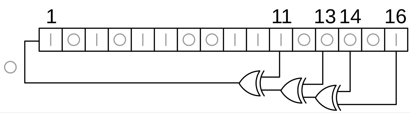 Fibonacci LFSRs就是多到1,就是多个抽头位置的值一起异或,生成的结果给到左边空出的那一位,而Galois LFSRs则是抽头位置前一级寄存器的值和输出寄存器的值异或后给到抽头位置的寄存器,贴张图: