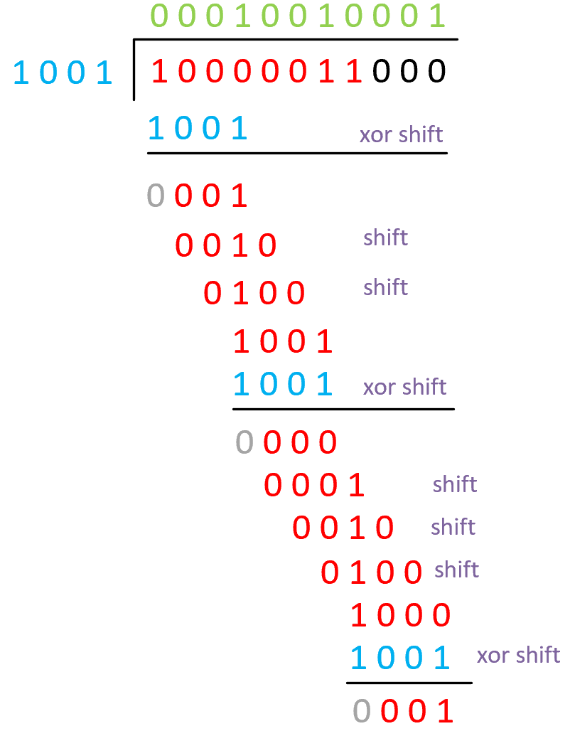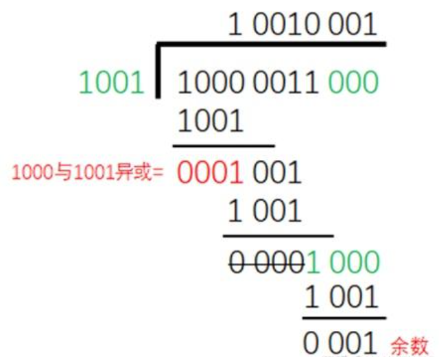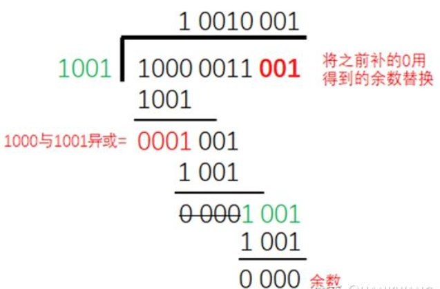 图里被除数是10000011,除数是1001,多项式就是X^3+1,0x01(最高位默认为1不写),图里我们看到它计算的时候是在原始数据10000011后面补了3个0,因为在多项式除法里,余数的最高次幂一定是小于除数最高次项,除数最高次为3,也就是4位,那余数最高次为2,也就是3位,所以是预留3位。换个角度想,补3个0,也就是把原始数据左移了3位,其实就是给后面把余数补上去时候,预先留的位置,虽然不知道余数是多少,但是余数的位数,一定数小于除数的位数。好,现在我们把余数补上去,再算一遍: