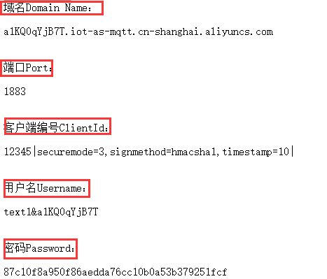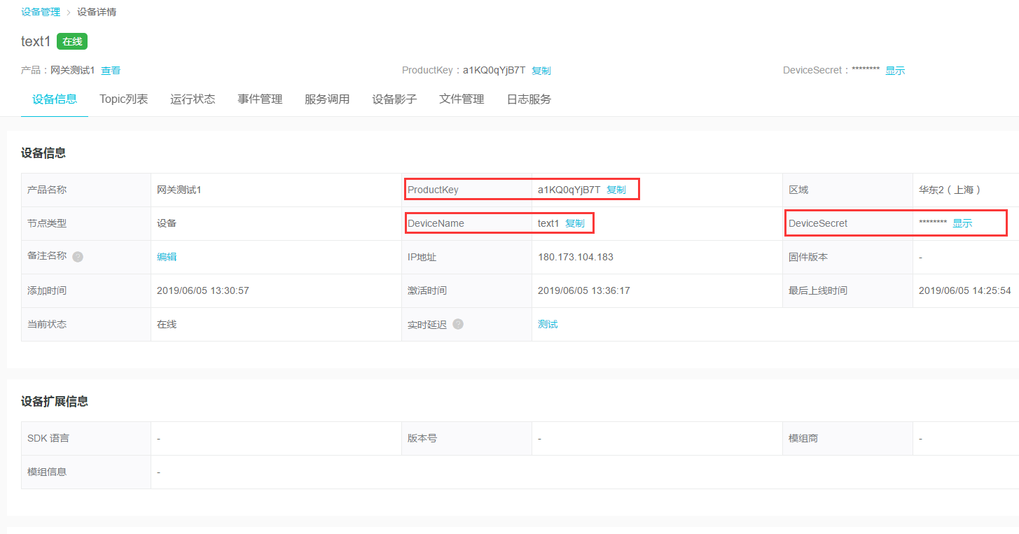 第一步 在创建了阿里云物联网产品并添加了设备后,可以查询到以下参数: