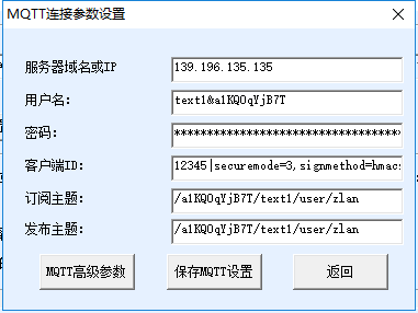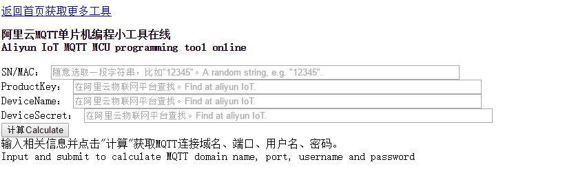 在网页中输入第一步中查询到的参数,其中SN/MAC填12345即可,点击“计算”,就会得到域名、端口、客户端编号、用户名、密码这5个MQTT配置参数。