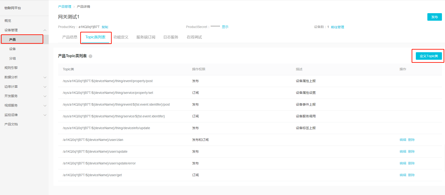 第四步:在建立了网关与物联网平台的TCP连接后,可以进行测试。首先我们需要在阿里云平台设备管理→产品→查看产品→Topic类列表中创建一个订阅/发布主题,如图所示点击“定义Topic类”进行创建: