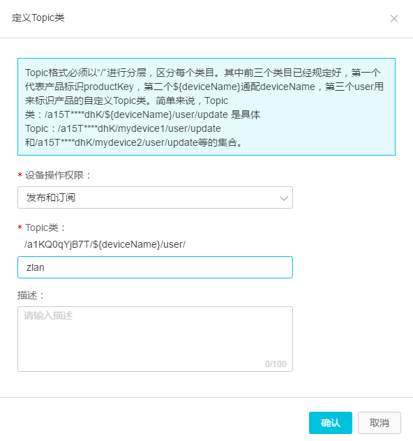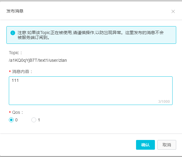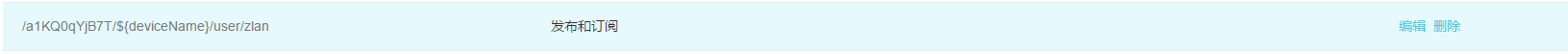 系统默认创建了可测试发和收的Topic:“/a1KQ0qYjB7T/${deviceName}/user/get”和“/a1KQ0qYjB7T/${deviceName}/user/update”,前面一个是填写在MQTT配置里的“订阅主题”中,后面一个填写在“发布主题”中。您也可以自定义一个发布和订阅都支持的Topic,这样MQTT配置里只需要填同一个Topic格式就行了,从而不用区分,如: