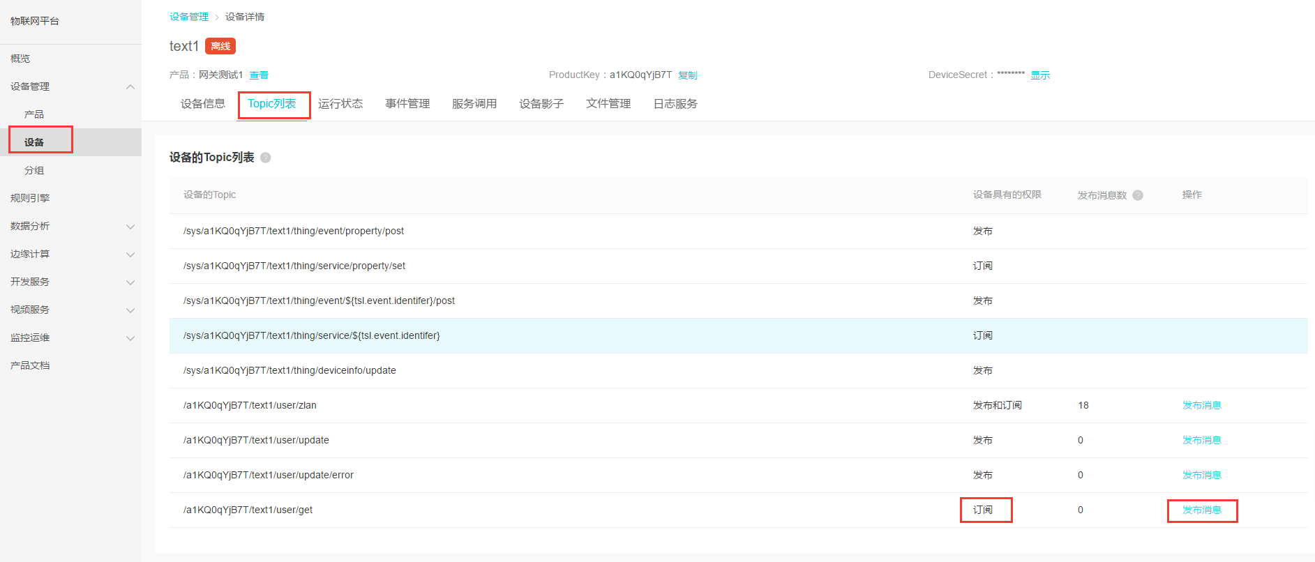 接着在阿里云平台设备管理→查看设备→Topic列表内选择一个已配置好的订阅主题进行物联网平台下发数据到comdebug的测试。