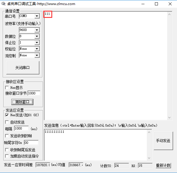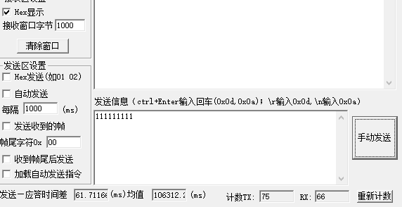 点击“发布信息”,如图中填写“111”(这里要用字符的格式发出),comdebug软件那能正常收到。