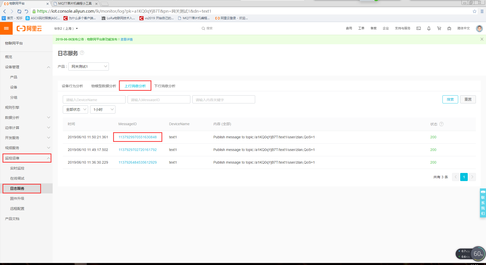这边发送后,我们要查看物联网平台那是否收到数据,物联网平台上选择监控运维→日志服务→上行消息分析,可以看到确实收到了数据。