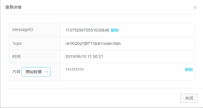 然后如果想查看数据的内容是否正确,点击上图红框中的MessageID,会弹出一个窗口,内容格式选择原始数据,查看上发数据是否正常。