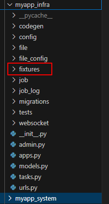 fixtures目录。myapp_system和myapp_infra是两个Django的应用,分别在其下创建fixtures目录