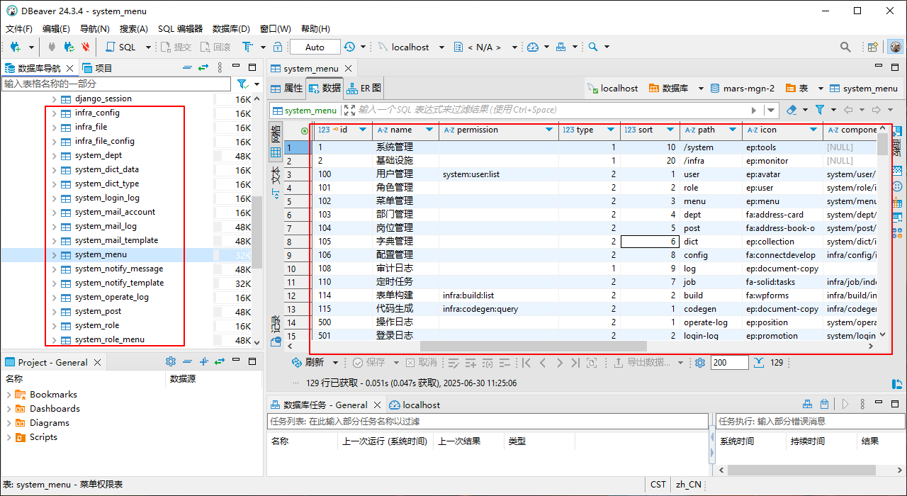 - 在项目开发时,向数据库添加了菜单、菜单权限、RBAC权限角色等初始化数据。如下图所示: