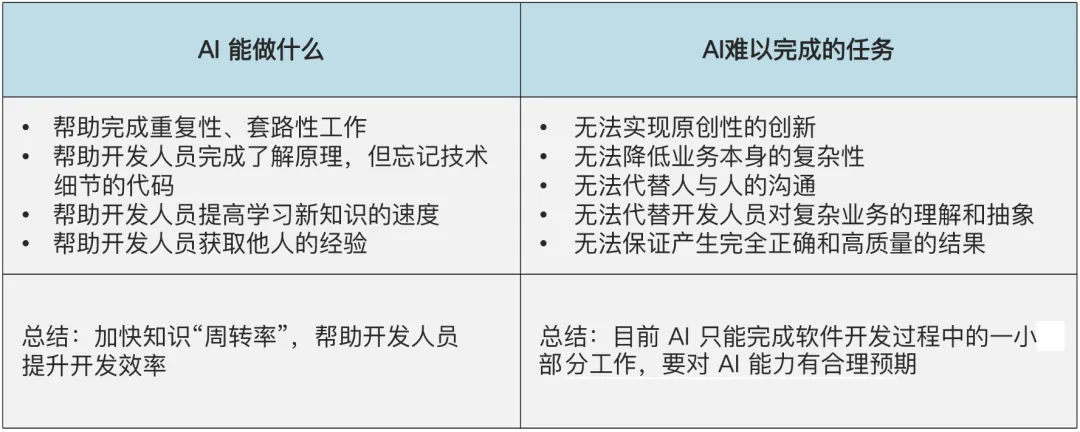 (6)结果正确性除了以上针对软件开发本质困难的分析以外,AI自身还有一个固有的局限性,即AI产生的内容,既不能保证是正确的,也不能保证是最优的,有时候常常“一本正经的胡说八道”。综上所述,目前的AI还不大可能是“银弹”,但是不代表AI没用,事实上已经在下面多个方面帮助我们更加高效地开发软件了,可以称得上是一枚“铜弹”!