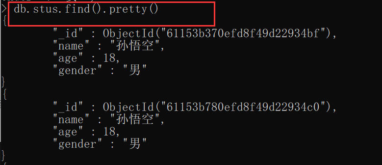 find()方法后.pretty()可将返回的数据格式化 find()方法返回的是一个数组