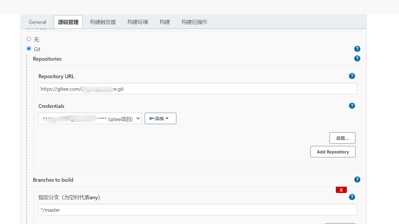 其中URL就是项目的git的地址,credentials是git登录凭据,还可以指定项目分支,