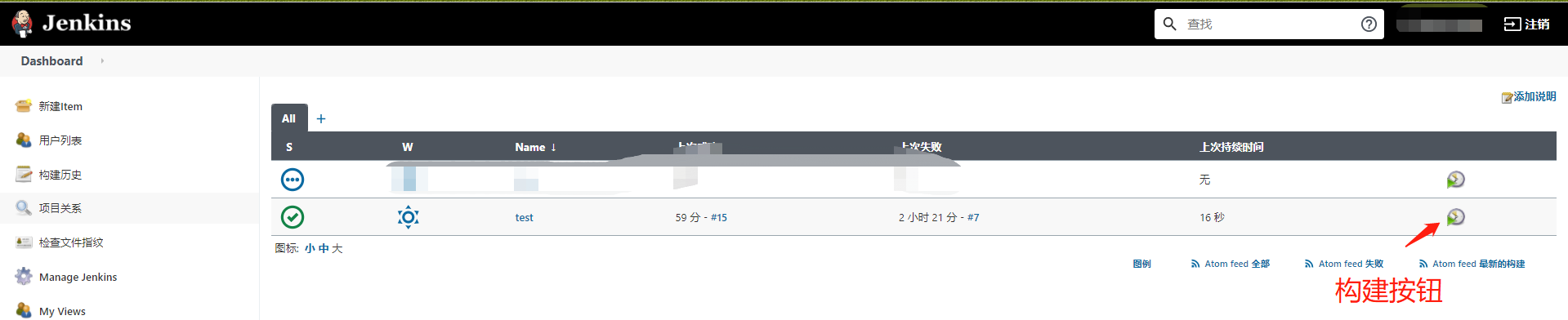 经过以上的配置,就已经配置好了一个jenkins项目了,返回到首页,就会有一个项目,点击构建按钮,就可以自动构建了
