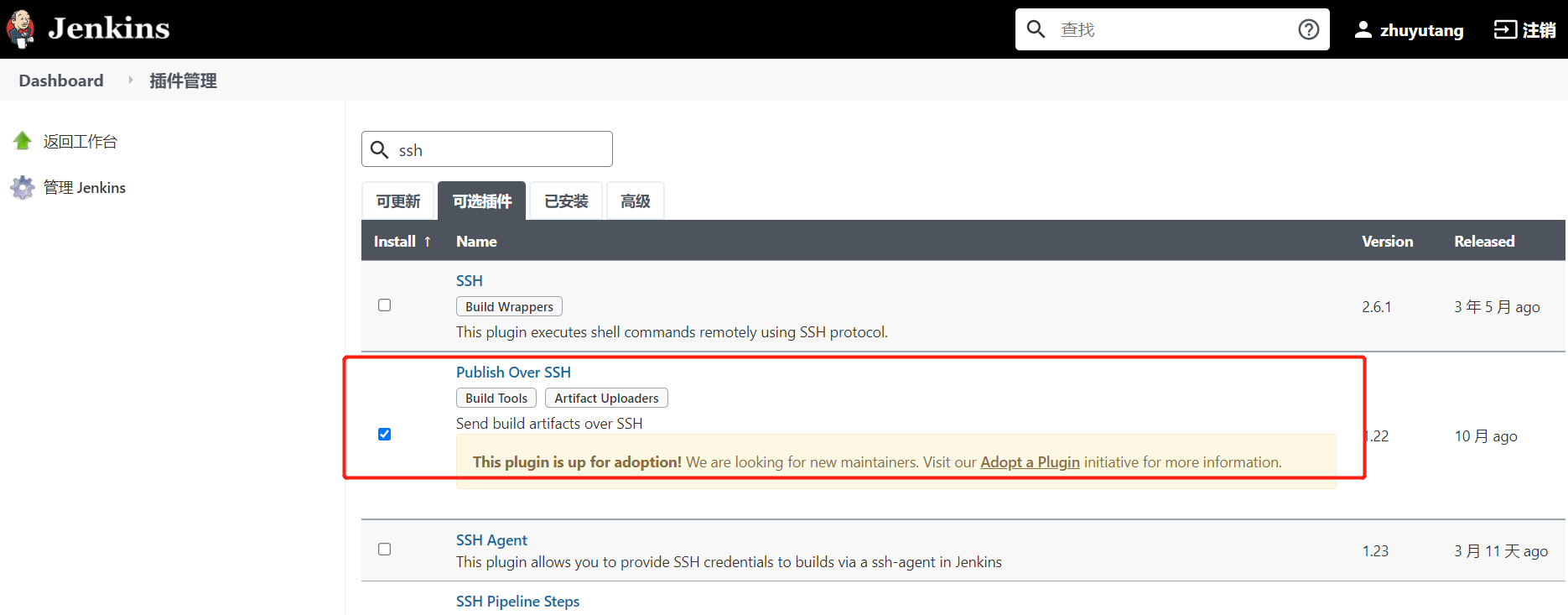 Jenkins自动部署Tomcat项目 1.安装jenkins 插件 启动Jenkins,进入系统管理-插件管理: 选择Deploy to container Plugin 插件安装: