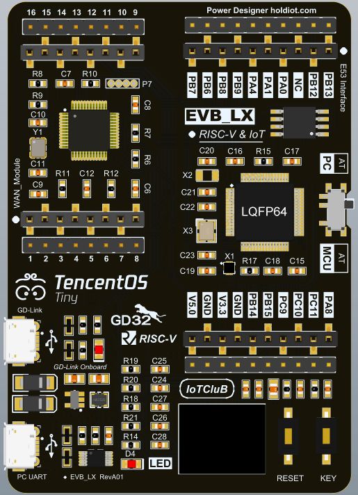 由兆易创新(GD32)赞助,业界首款基于RISC-V的IoT开发板,可支持WiFi、NB-IoT、2G、LoRaWAN等多种通信方式扩展,同时支持E53传感器扩展,可应用于多场景IoT方案验证。