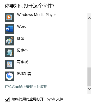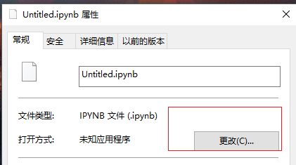 - 接下来在你的电脑里任意寻找一个 .ipynb 文件,然后点击其属性,点击打开方式后面的更改按钮,然后选择上一步所建立的 .bat 文件