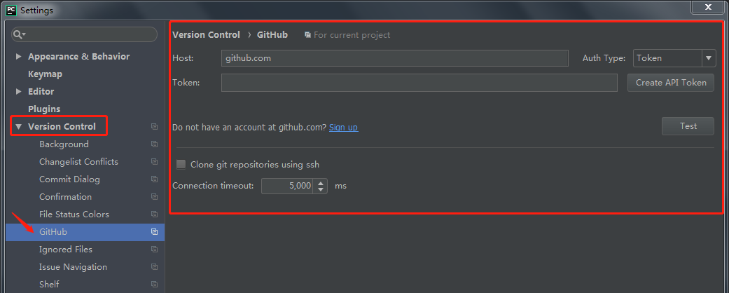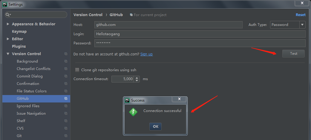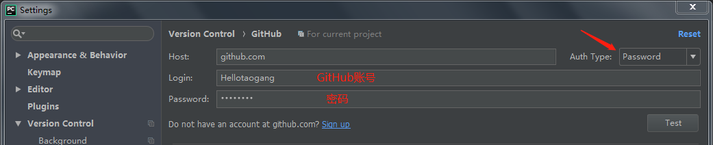 3.然后进行连接GitHub的配置(Auth Type选择密码Password)