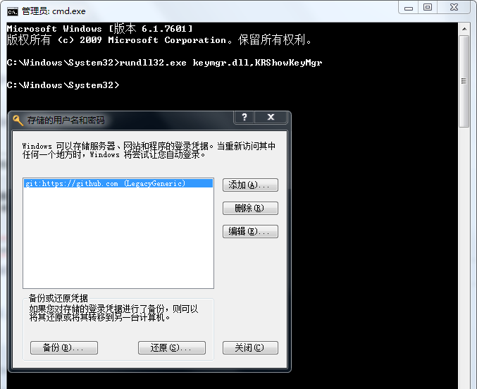 打开本地Windows的cmd命令窗口,输入 rundll32.exe keymgr.dll,KRShowKeyMgr 将之前存储的git提交时保留的用户名密码删除