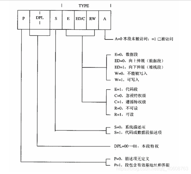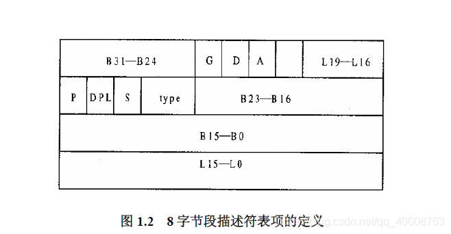 B31--B24表示基地址(base)的高8位,B23-B0表示基地址的地24位。因为在一开始的实际中,Intel是采用了24位地址线,后来又改为32位地址。L19--L16 和 L15--L0表示段长,DPL是个2位的位段,代表访问本段需要的特权。