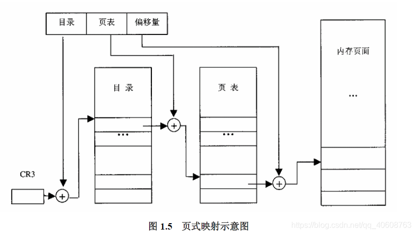 可以看出,在页面目录中共有$2^{10}=1024$个目录项,每个目录项指向一个页面表,而每个页面表又共有1024个页面描述项。类似于GDTR和LDTR,又增加了一个新的寄存器CR3作为指向当前页面目录的指针,这样,从线性地址到物理地址的映射为: