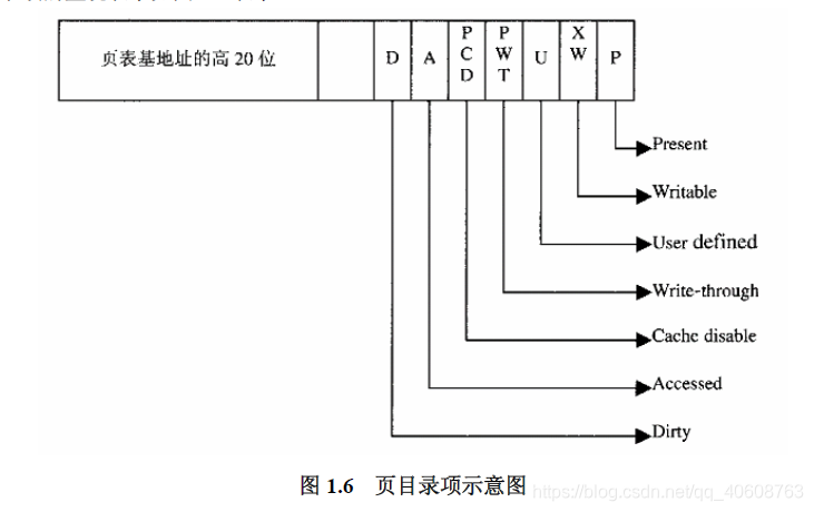 如前所述,目录项中含有一个指向页表的指针,而页表项中含有指向一个页面其实地址的指针。由于页面表和页面的起始位置总是在4K的边界上,所以低12位一定为0。这样,目录项和页表项中只要用20为用于指针就可以了。