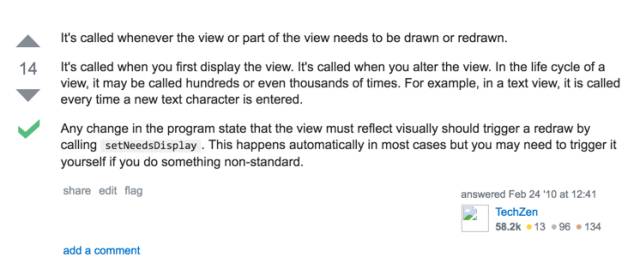 Apple 官方文档已经明确说明,开发者不应该直接调用 layoutSubviews 与 drawRect: ,而应该在你认为系统默认的布局和重绘不能带给你想要的效果时,在子类中重写这些方法,然后分别通过 setNeedsLayout 和 setNeedsDisplayInRect: 来进行调用。