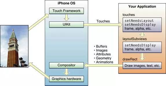 (我个人对 View Drawing Cycle 的理解是这样的:UIKit 需要处理非常多的事件,这些事件组合起来变成了一个非常复杂的事件序列,在这个序列中有些特定的点是 UIKit 专门提供给 UIView 来进行视图更改的。如上所述,在当前 run loop 结束之前,我们有机会做各种视图更改,并且这些更改会在下一个 run loop 体现出来,所以 View Drawing Cycle 就是一次次 run loop 中我们通过 UIKit 得到的 UIView 重布局、重绘机会所组成的循环。有理解不对的地方,欢迎评论指正。)