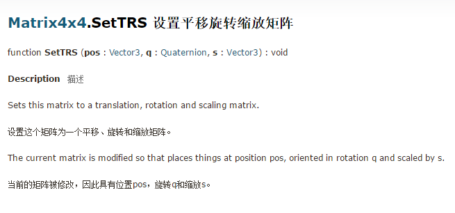 这段代码很简单,就是声明一个 4x4 的矩阵,然后调用该 4x4 矩阵的 SetTRS 函数(T 代表 Translate(平移)、R 代表 Rotation(旋转)、S 代表 Scale(缩放))。该函数用来设置一个平移、旋转、缩放矩阵。在代码中,我们传入的是该物体的 position、rotation、localScale,这样做是为了便于观察相应的变换矩阵。