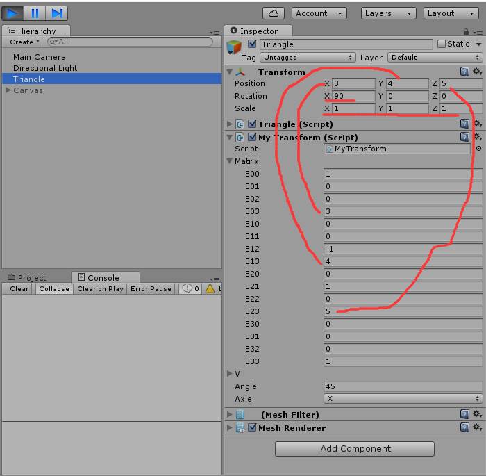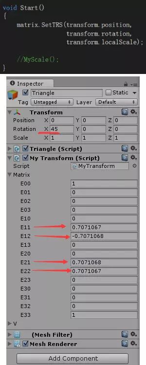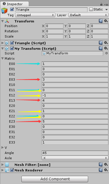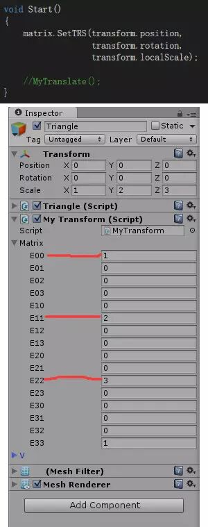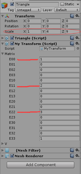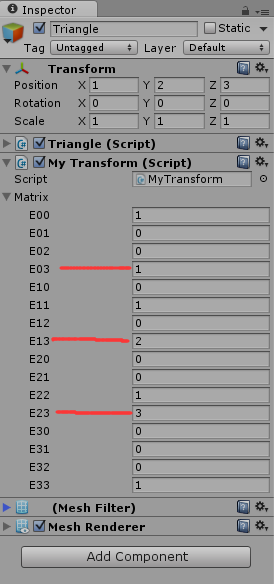 回到我们的场景中,找到“Triangle”物体,在 Inspector 面板中修改“MyTransform”脚本的“Matrix”属性,如下图所示:
