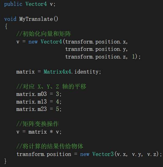 接下来,我们利用平移矩阵做个简单的平移,让我们回到“MyTransform”脚本中添加一些代码: