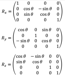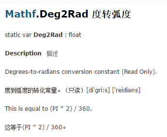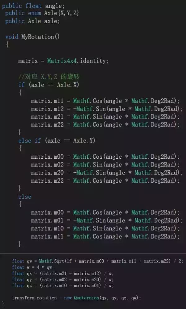 接下在“MyRotation”函数中初始化了矩阵。接下来的判断语句就是对应各个轴上的旋转(可以与上面那张旋转矩阵进行对比,相信大家都能懂吧),在判断语句中主要用到了三个函数:Mathf.Sin()、Mathf.Cos()、Mathf.Deg2Rad()。前面两个函数大家都知道是什么了吧,后面那个函数用于弧度转角度,因为前面两个函数接受的是一个弧度制的值。