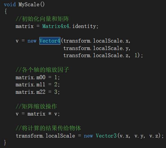 matrix.m22 = z; v4 = matrix * v4; transform.localScale = new Vector3 (v4.x, v4.y, v4.z);