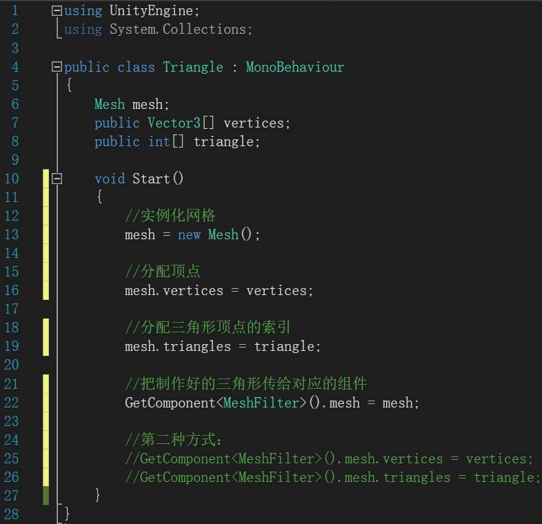在代码中的“vertices”就是所谓的顶点数组、”triangles“就是所谓的三角形数组,它的作用其实就是对应顶点的索引。一般一个三角形是由三个顶点组成的。