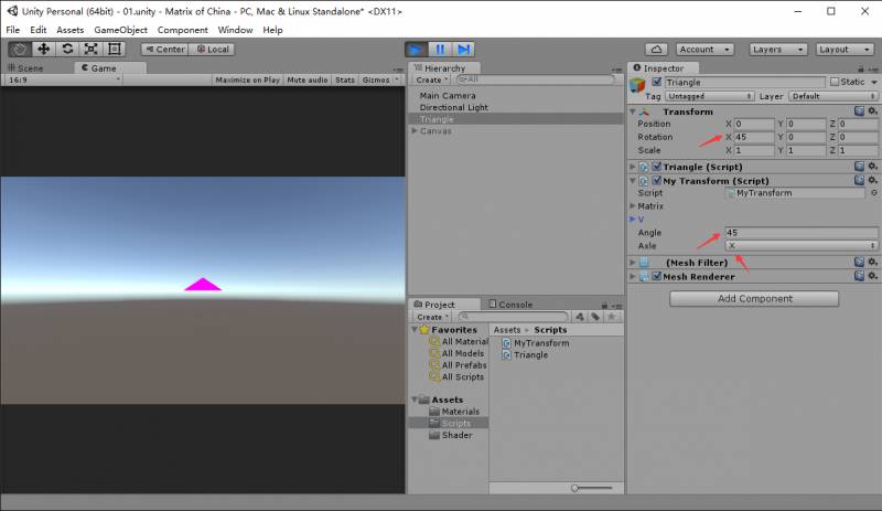 首先创建一个 C# 脚本,命名为“MyTransform”,并为我们的“Triangle”物体添加此脚本。代码如下: